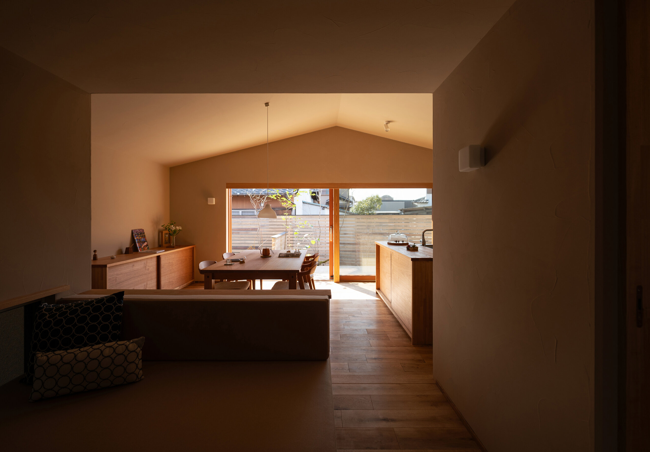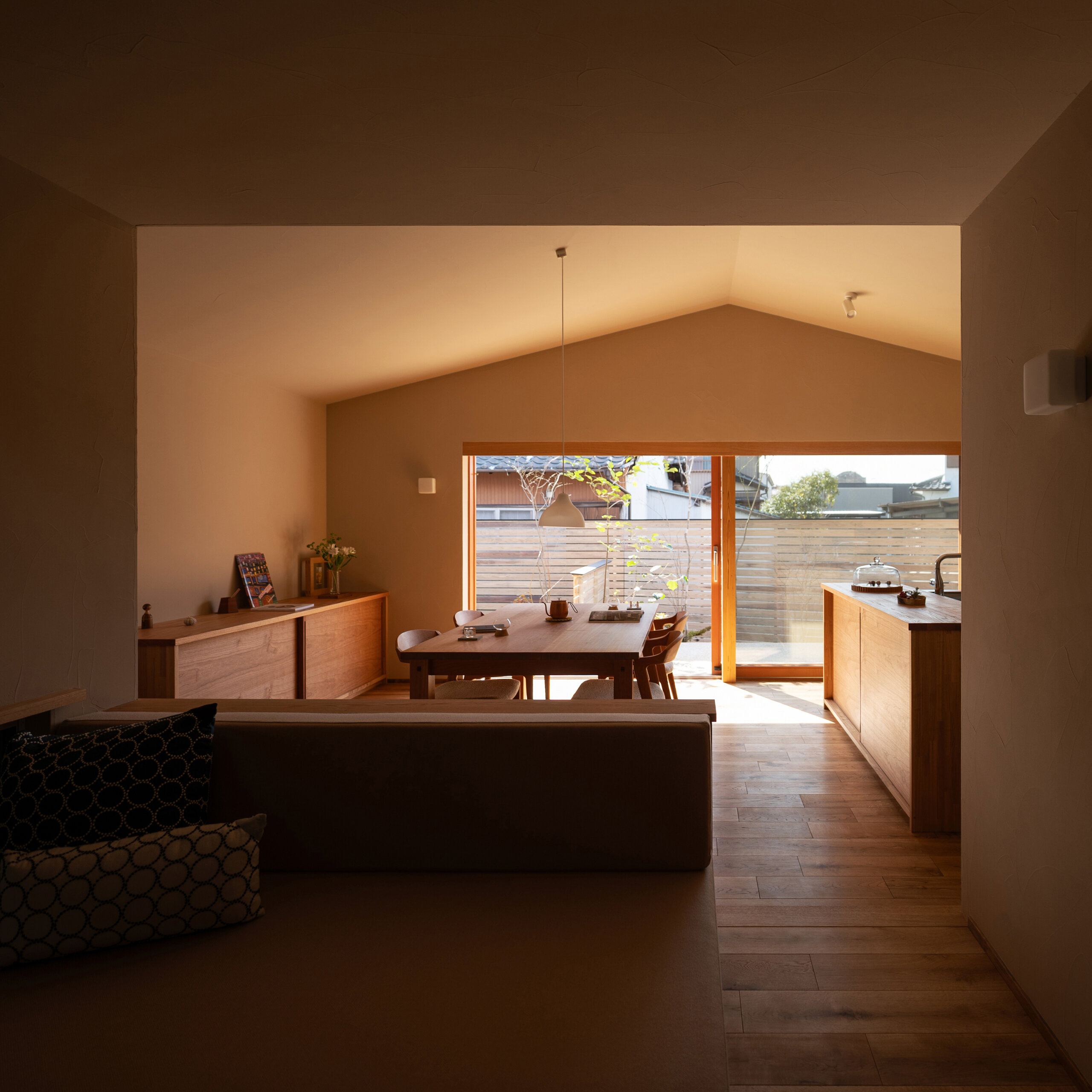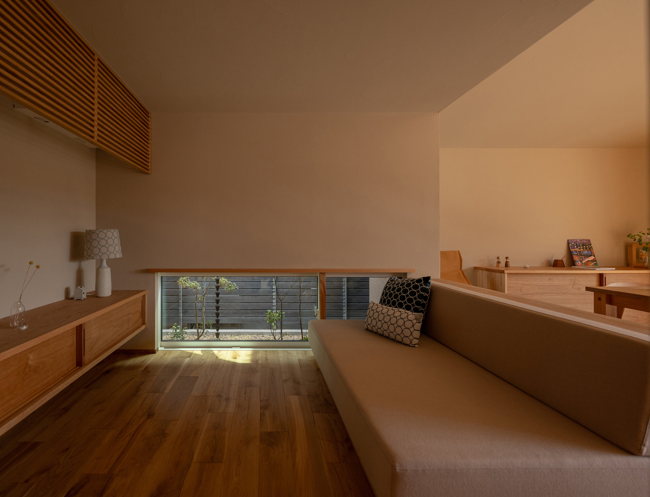これらの庭が、平屋の内部へ柔らかく光と気配を流し込み、